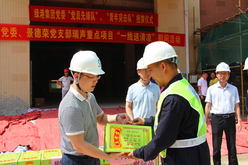 此次活動(dòng)也是綠港集團(tuán)黨委在今年開展“四個(gè)一線”爭先鋒、創(chuàng)建黨建示范品牌工作以來,在項(xiàng)目建設(shè)一線開展創(chuàng)建“黨員攻堅(jiān)先鋒隊(duì)”活動(dòng)的重要舉措之一?!八膫€(gè)一線”是綠港集團(tuán)黨委圍繞經(jīng)開區(qū)黨工委加強(qiáng)基層黨建三年行動(dòng)計(jì)劃,結(jié)合集團(tuán)公司項(xiàng)目建設(shè)、企業(yè)服務(wù)、招商銷售、項(xiàng)目融資的四個(gè)任務(wù),以“抓黨建促發(fā)展,抓品牌促提升”為主題,組織號召廣大黨團(tuán)員積極開展在項(xiàng)目一線創(chuàng)建“黨員攻堅(jiān)先鋒隊(duì)”、在服務(wù)企業(yè)一線創(chuàng)建“服務(wù)示范標(biāo)兵(窗口)”、在招商銷售一線創(chuàng)建“一個(gè)黨員一面旗,我為綠港做代言”、在項(xiàng)目融資一線“爭做黨員領(lǐng)頭雁”的活動(dòng)。活動(dòng)開展以來,集團(tuán)黨建真正實(shí)現(xiàn)了“走前頭、作表率”的目標(biāo),引導(dǎo)集團(tuán)公司全體黨員干部轉(zhuǎn)變工作作風(fēng)、提高工作效能、強(qiáng)化服務(wù)意識,在促進(jìn)綠港集團(tuán)樹立國企黨建標(biāo)桿,不斷提升社會形象起到引領(lǐng)作用。授旗儀式結(jié)束后,綠港集團(tuán)與會領(lǐng)導(dǎo)還給項(xiàng)目一線參建人員送上了王老吉、西瓜水果等清涼慰問品,鼓勵(lì)他們繼續(xù)發(fā)揚(yáng)綠港鐵軍精神,急難險(xiǎn)重顯身手,同時(shí)要注意防暑降溫、保重身體,更好地為項(xiàng)目建設(shè)做貢獻(xiàn)。(綠港集團(tuán) 陽正輝、張彩秀/文、圖)