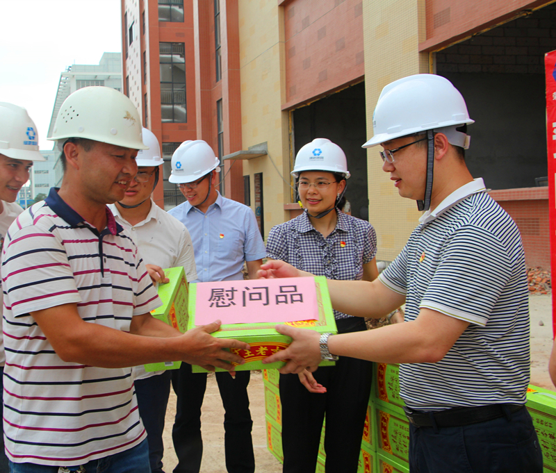 在建黨98周年前夕,綠港集團(tuán)黨委攜集團(tuán)工會和榮鑫公司黨支部開展以“送清涼、送健康、送安全”為主題的重點項目一線“送清涼”慰問活動。6月19日下午,集團(tuán)黨委書記、董事長、總經(jīng)理龔國強(qiáng)帶領(lǐng)集團(tuán)領(lǐng)導(dǎo)班子,頂著烈日、迎著熱浪,來到集團(tuán)重點項目——瑞聲科技(南寧)廠房裝修工程(二期)施工現(xiàn)場,親切慰問看望在炎炎夏日中奮戰(zhàn)在項目建設(shè)一線的“黨員先鋒隊”、“青年突擊隊”隊員及各施工班組的建設(shè)者,送去了集團(tuán)黨委、集團(tuán)工會和榮鑫公司黨支部的關(guān)心和敬意,為他們加油鼓勁、提振士氣。