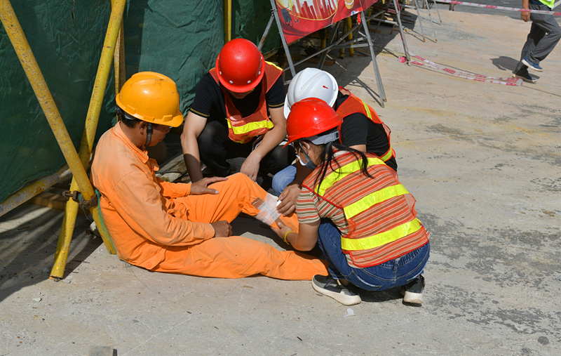 現(xiàn)場模擬一名工人在2#、3#廠房間的廊架上進行施工作業(yè)時,因未系安全帶、腳下未踩穩(wěn)造成高處墜落受傷,其他人員對其進行急救的情況。從發(fā)現(xiàn)人員墜落受傷、疏散人群、封鎖現(xiàn)場到對受傷人員骨折部位用夾板進行固定再送至醫(yī)院,僅歷時10分鐘。整個過程緊張有序,應急處理得當。演練中,現(xiàn)場每名救援人員嚴肅認真對待每個演練細節(jié)。各應急小組聞聲而動,各司其職,反應迅速,各環(huán)節(jié)無縫銜接,使救援任務得以順利完成。
