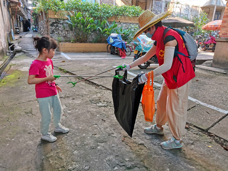 小小志愿者不懼烈日撿垃圾