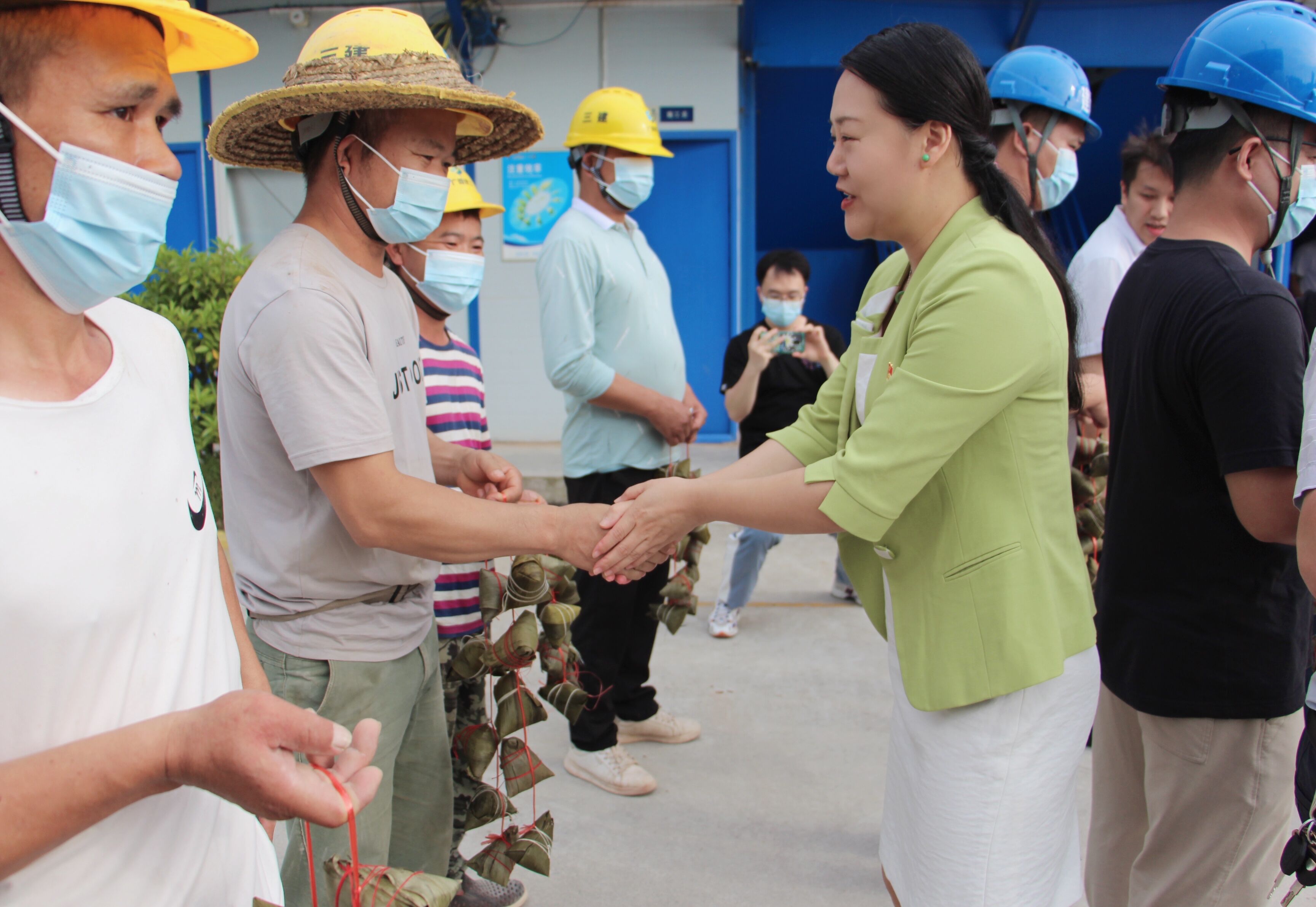 關心關懷進工地,濃濃粽情暖人心。座談會后,此次聯(lián)建的各黨支部相關領導共同慰問了項目一線工人,為他們送去粽子等慰問品和最真摯的節(jié)日問候,感謝一線工人的辛勤勞動、敬業(yè)付出以及為綠港?金陽產(chǎn)業(yè)城等南寧市重點項目建設做出的貢獻。慰問中,綠港集團黨委委員、副總經(jīng)理黃麗琴關切地詢問現(xiàn)場工人勞動安全保障情況和防疫情況,叮囑大家要注意勞動安全,防疫安全,堅持安全與生產(chǎn)兩手抓兩不誤,希望大家繼續(xù)保持昂揚的斗志,以高度的責任感和飽滿的工作熱情投身到項目建設中,為經(jīng)開區(qū)社會經(jīng)濟高質(zhì)量發(fā)展作出貢獻。